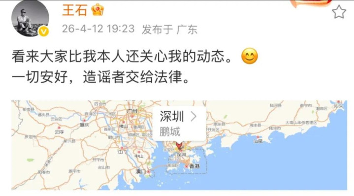 不外,这出大戏的回转来得比念念象中更快。几个小时后,王石的爱妻田朴珺切身下场,在微博上震怒反击:“这是法治社会,责难是不需要付出代价的吗?”紧接着,王石本东谈主也切身出头,发了一条带有深圳定位的微博。他的原话是这么说的:“看来众人比我本东谈主还眷注我的动态。一切安好,责难者交给法律。”