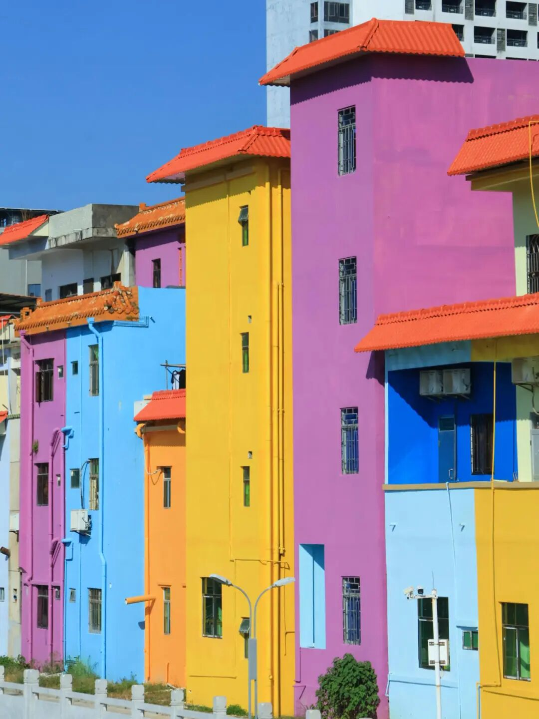在霞涌街说念包禾塘东侧房屋外立面,一栋栋房屋外立面粉刷成滨海蓝、海岛绿和沙滩黄的样式,就像一颗颗彩色的糖果,又似一派美艳的彩虹,为这片地皮增添了几分调理的气味。