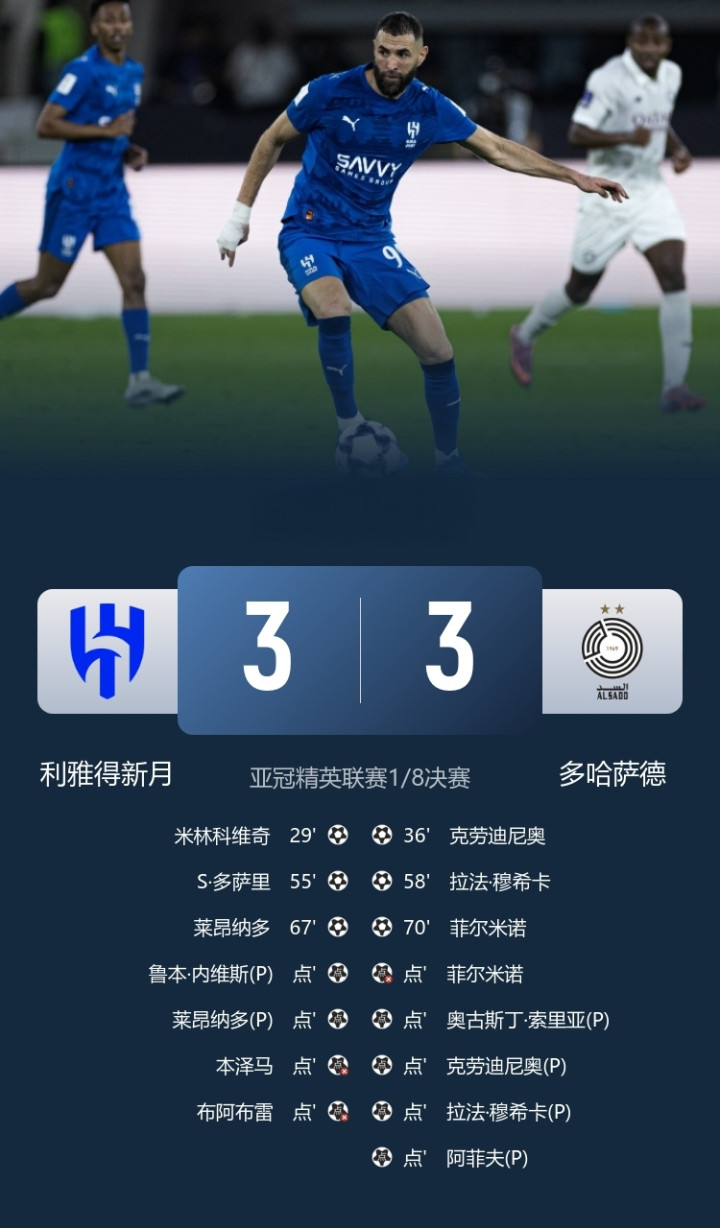北京本领4月14日凌晨2时,亚冠精英联赛1/8决赛,利雅得月牙vs多哈萨德。两边90分钟3-3战平,加时赛均无建设,投入点球大战,本泽马和菲尔米诺失点,利雅得月牙总比分5-7不敌多哈萨德遭淘汰,无缘亚冠精英联赛8强!