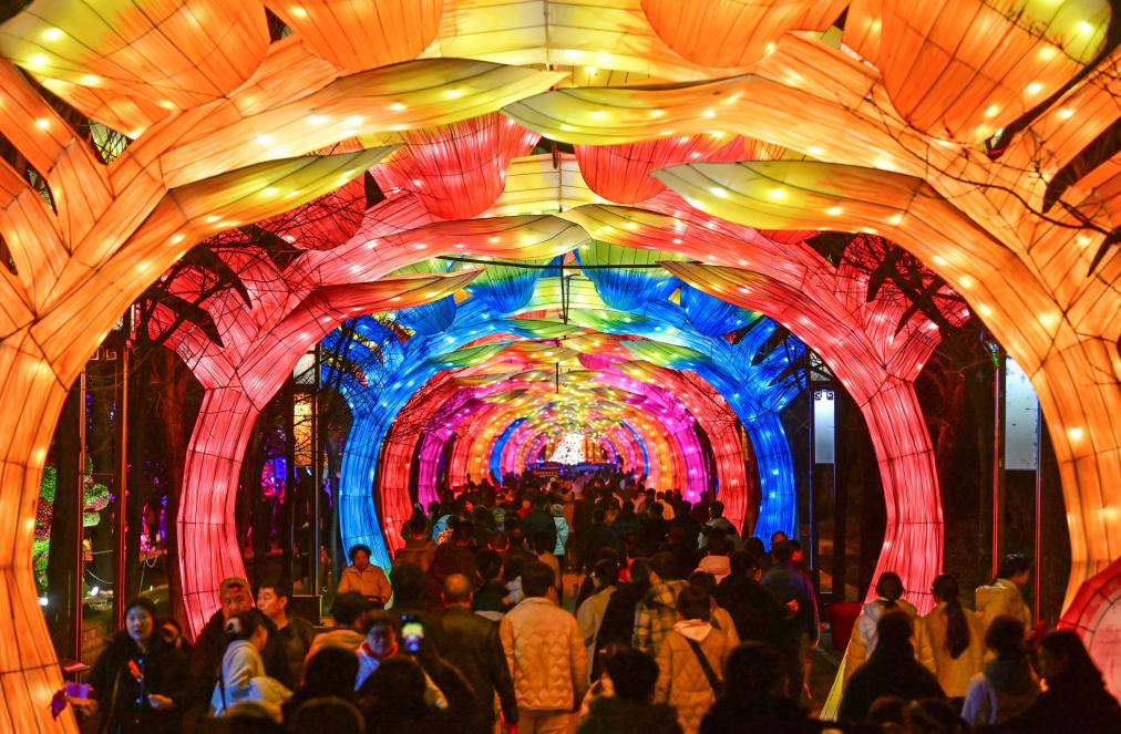 2月19日,旅客在河南省洛阳市隋唐城名胜植物园观赏“神齐上元灯会”主题特质灯展。新华社发(李卫超 摄)