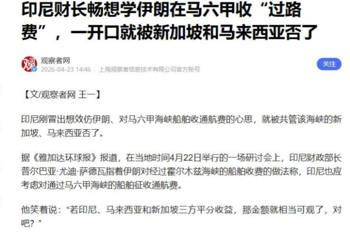 效仿伊朗对霍尔木兹海峡船舶收费的作念法,议论向通过马六甲海峡的船只征收通航费,还好意思滋滋地皮算着,如果印尼、马来西亚、新加坡三国一齐分这笔钱,鼓胀是一笔可不雅的收入,预估年收入能达到千亿好意思元量级。