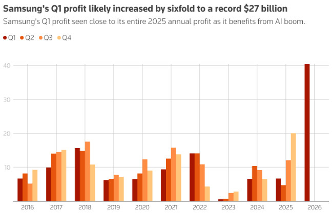 与三星DX部门的头焦额烂比较,细密存储业务的DS部门显得蒸蒸日上。2026年第一季度,三星归并交易利润达57.2万亿韩元(约合2610亿元东说念主民币),同比暴增755%,创下历史最高记录。这其中存储芯片功不成没,里昂证券韩国斟酌部阁下桑吉夫·拉纳估算,三星存储芯片业务对总交易利润占比或将接近90%。